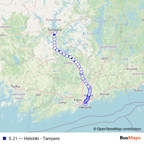 The first stop of the S 21 rail route is Helsinki and the last stop is Tampere. S 21 (Helsinki - Tampere) is operational during joka päivä.
