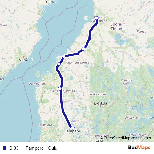 The first stop of the S 33 rail route is Tampere and the last stop is Oulu. S 33 (Tampere - Oulu) is operational during arkipäivisin.