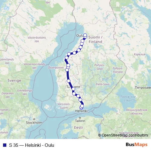 The first stop of the S 35 rail route is Helsinki and the last stop is Oulu. S 35 (Helsinki - Oulu) is operational during joka päivä.