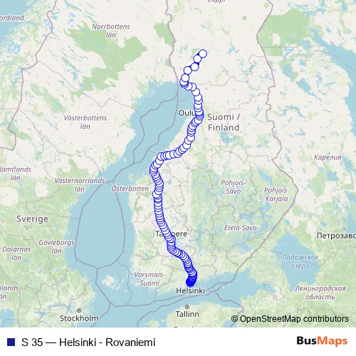 The first stop of the S 35 rail route is Helsinki and the last stop is Rovaniemi. S 35 (Helsinki - Rovaniemi) is operational during joka päivä.
