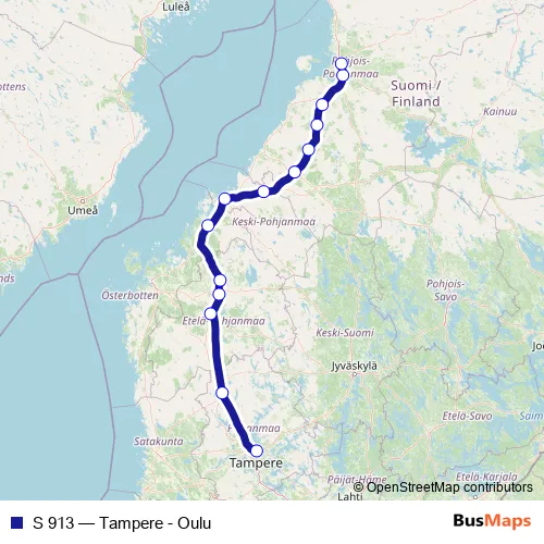 The first stop of the S 913 rail route is Tampere and the last stop is Oulu. S 913 (Tampere - Oulu) is operational during joka päivä.