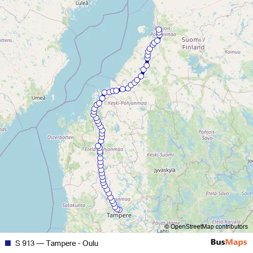 The first stop of the S 913 rail route is Tampere and the last stop is Oulu. S 913 (Tampere - Oulu) is operational during joka päivä.