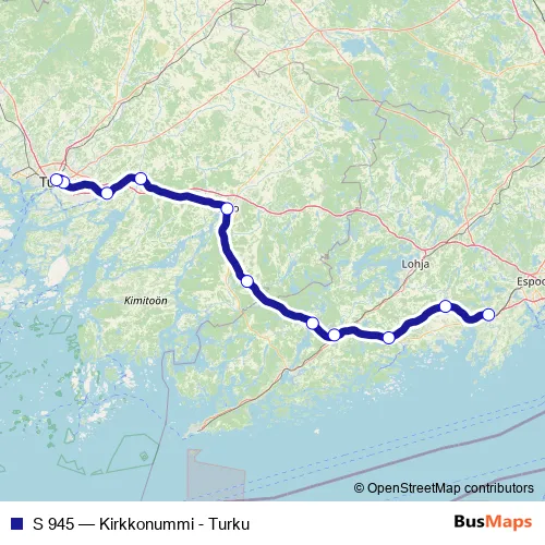The first stop of the S 945 rail route is Kirkkonummi and the last stop is Turku. S 945 (Kirkkonummi - Turku) is operational during joka päivä.