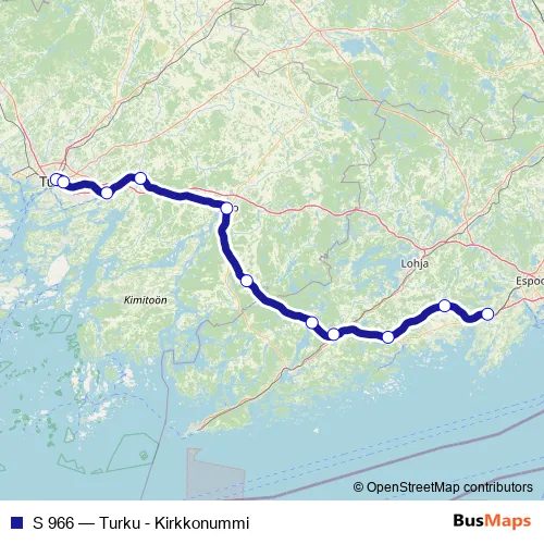 The first stop of the S 966 rail route is Turku and the last stop is Kirkkonummi. S 966 (Turku - Kirkkonummi) is operational during joka päivä.