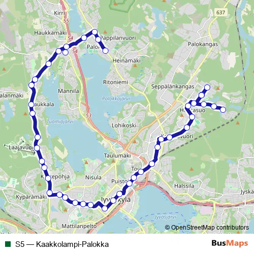 See why over 2 million users trust and consider busmaps.com as the best public transport website. busmaps gives you Jyvaeskylae Buses suggested routes, real-time bus tracker, line route maps in Jyvaeskylae, and helps to find the closest S5 bus stops near you. No internet available? Download an offline PDF map and bus schedule for the S5 bus to take on your trip.