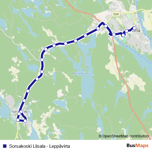 Sorsakoski Liisala - Leppävirta bus Route Map