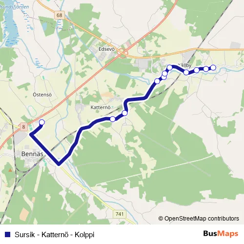The first stop of the Sursik - Katternö - Kolppi bus route is Sursik skola and the last stop is