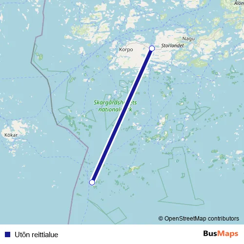 The first stop of the Utön reittialue ferry route is Utö and the last stop is Pärnäs (Nauvo). Utön reittialue (Utön reittialue) is operational during joka päivä.