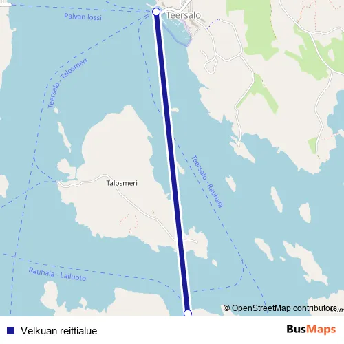 The first stop of the Velkuan reittialue ferry route is Rauhala and the last stop is Teersalo. Velkuan reittialue (Velkuan reittialue) is operational during joka päivä.