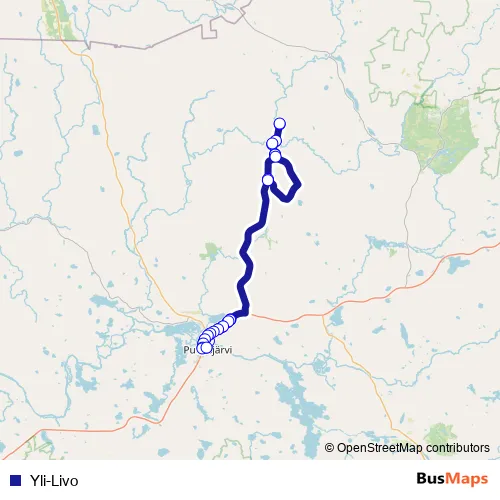 The first stop of the Yli-Livo bus route is Pudasjärvi and the last stop is Pudasjärvi. Yli-Livo is operational during arkipäivisin.