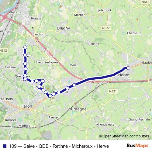 The first stop of the 109 bus route is Herve Nazareth and the last stop is Saive Vieux Château. 109 (Saive - QDB - Retinne - Micheroux - Herve) is operational during en semaine.