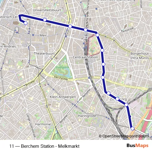 The first stop of the 11 tram route is Berchem Station perron 14 and the last stop is Antwerpen Melkmarkt. 11 (Berchem Station - Melkmarkt) is operational during tous les jours.