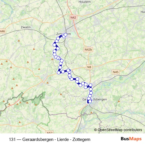 The first stop of the 131 bus route is Geraardsbergen Station perron 9 and the last stop is Zottegem Station perron 7. 131 (Geraardsbergen - Lierde - Zottegem) is operational during en semaine.