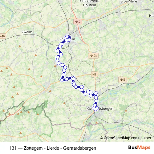 The first stop of the 131 bus route is Zottegem Station perron 7 and the last stop is Geraardsbergen Station perron 9. 131 (Zottegem - Lierde - Geraardsbergen) is operational during en semaine.