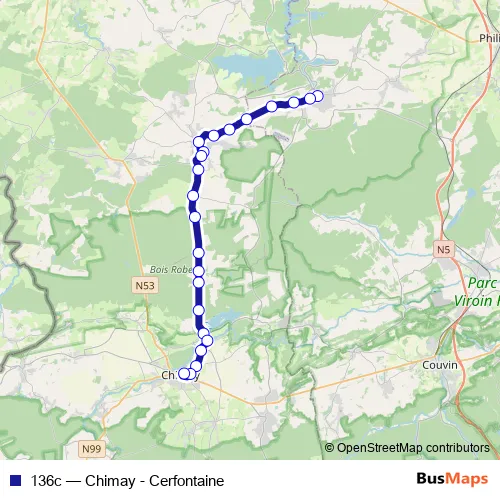 The first stop of the 136c bus route is Cerfontaine Place and the last stop is Chimay Gare - Quai 01. 136c (Chimay - Cerfontaine) is operational during en semaine.