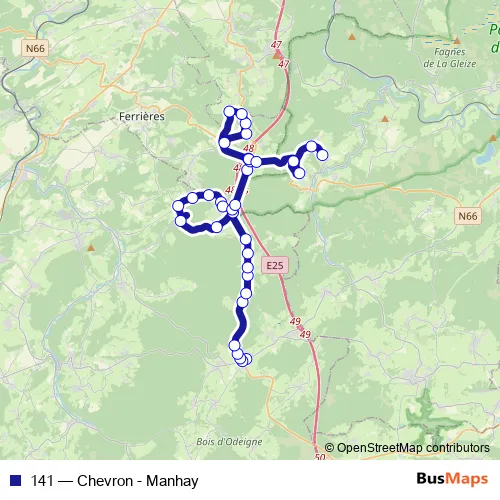 The first stop of the 141 bus route is Manhay Athénée and the last stop is Chevron Monument. 141 (Chevron - Manhay) is operational during en semaine.