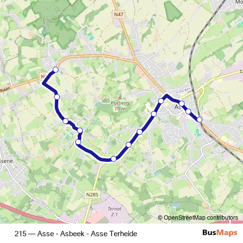 The first stop of the 215 bus route is Asse Station and the last stop is Asse Terheide Kerk. 215 (Asse - Asbeek - Asse Terheide) is operational during en semaine.