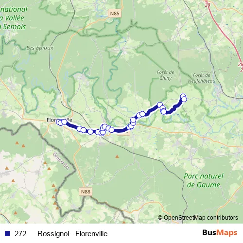 The first stop of the 272 bus route is Florenville Place du Miroir - Quai 1 and the last stop is Rossignol Carrefour. 272 (Rossignol - Florenville) is operational during en semaine.
