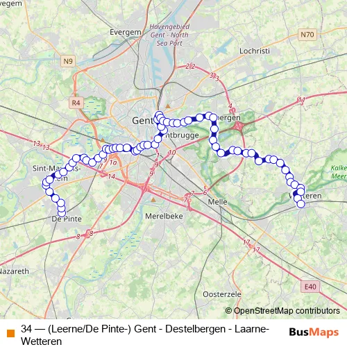 The first stop of the 34 bus route is De Pinte Station Florastraat and the last stop is Wetteren Station perron 1. 34 ((Leerne/De Pinte-) Gent - Destelbergen - Laarne-Wetteren) is operational during tous les jours.