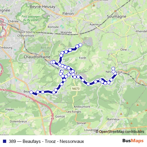 The first stop of the 389 bus route is Beaufays Air Pur and the last stop is Nessonvaux Ecole Communale. 389 (Beaufays - Trooz - Nessonvaux) is operational during en semaine.