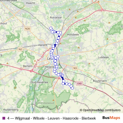 Speelpleinstraat - Hoogstraat - Dassenstraat - Blandenstraat - Interleuvenlaan - Ambachtenlaan - Hertogstraat - Kerspelstraat - Pakenstraat - Tivolistraat - Geldenaaksebaan - Parkstraat - Andreas Vesaliusstraat - Blauwe steen - Maria-Theresiastraat - Oostertunnel - Bondgenotenlaan - Dirk Boutslaan - Halvestraat - Mechelsestraat - Lüdenscheidsingel - Albert Woutersstraat - Hagelandstraat - Spaarzaamheidstraat - Aarschotsesteenweg - Oudstrijderslaan - Aarschotsesteenweg - Weggevoerdenstraat - Pastoor Bellonstraat - Sint-Hadrianusstraat - Casinolaan - Baron E. Descampslaan - Kroonstraat