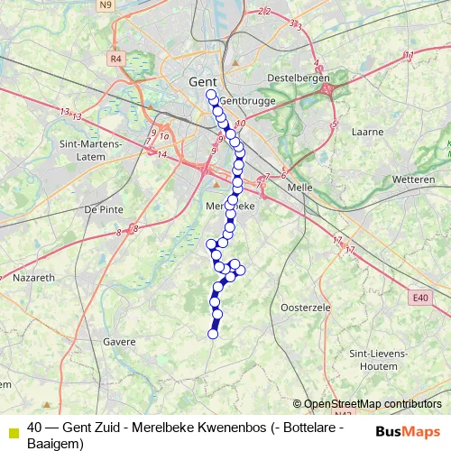 The first stop of the 40 bus route is Gent Zuid perron 7 and the last stop is Baaigem Bosstraat. 40 (Gent Zuid - Merelbeke Kwenenbos (- Bottelare - Baaigem)) is operational during tous les jours.