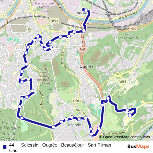 The first stop of the 44 bus route is Sart-Tilman Chu and the last stop is Sclessin Standard - Quai A. 44 (Sclessin - Ougrée - Beauséjour - Sart-Tilman - Chu) is operational during tous les jours.