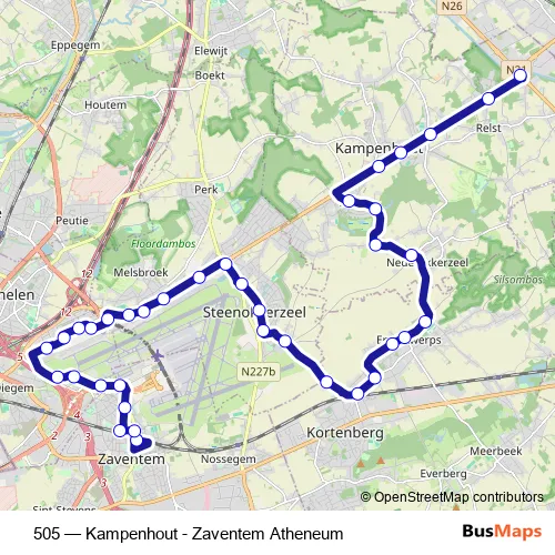 The first stop of the 505 bus route is Zaventem Atheneum and the last stop is Kampenhout Sas. 505 (Kampenhout - Zaventem Atheneum) is operational during en semaine.