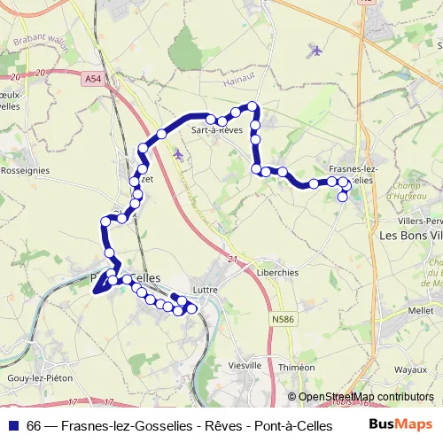 The first stop of the 66 bus route is Frasnes-LEZ-Gosselies Place Communale and the last stop is Luttre Gare Sncb. 66 (Frasnes-lez-Gosselies - Rêves - Pont-à-Celles) is operational during en semaine.