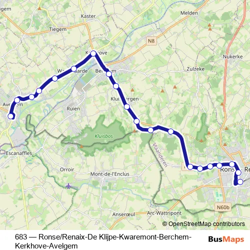 The first stop of the 683 bus route is Avelgem Station perron 3 and the last stop is Ronse Station perron 5. 683 (Ronse/Renaix-De Klijpe-Kwaremont-Berchem-Kerkhove-Avelgem) is operational during en semaine.
