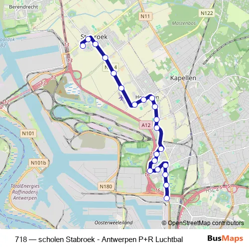 The first stop of the 718 bus route is Stabroek Pito and the last stop is Antwerpen P+R Luchtbal. 718 (scholen Stabroek - Antwerpen P+R Luchtbal) is operational during en semaine.