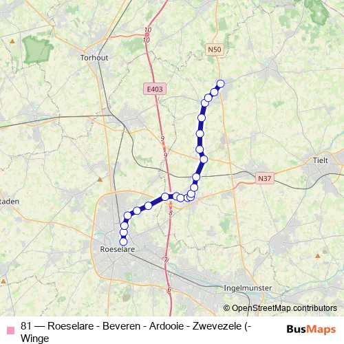 The first stop of the 81 bus route is Roeselare, Station perron 6 and the last stop is Zwevezele, Hille. 81 (Roeselare - Beveren - Ardooie - Zwevezele (- Winge) is operational during en semaine.