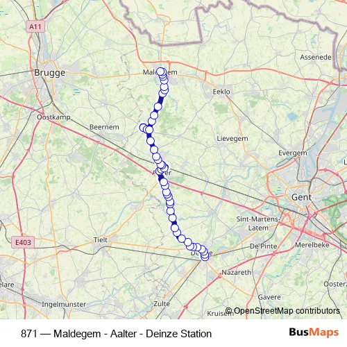 The first stop of the 871 bus route is Deinze Station perron 2 and the last stop is Aalter Station perron 1. 871 (Maldegem - Aalter - Deinze Station) is operational during en semaine.