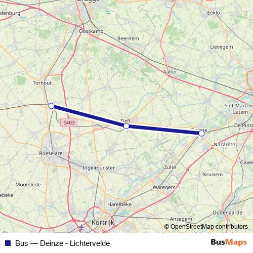 The first stop of the Bus bus route is Deinze and the last stop is Lichtervelde. Bus (Deinze - Lichtervelde) is operational during le week-end.
