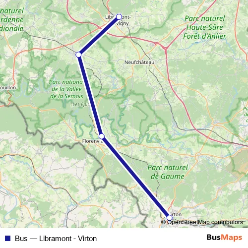 The first stop of the Bus bus route is Libramont and the last stop is Virton. Bus (Libramont - Virton) is operational during le week-end.