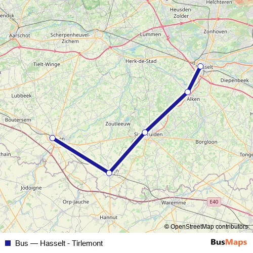 The first stop of the Bus bus route is Tirlemont and the last stop is Hasselt. Bus (Hasselt - Tirlemont) is operational during en semaine.