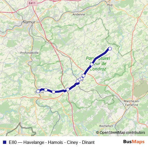 The first stop of the E80 bus route is Havelange Eglise and the last stop is Dinant Gare. E80 (Havelange - Hamois - Ciney - Dinant) is operational during tous les jours.