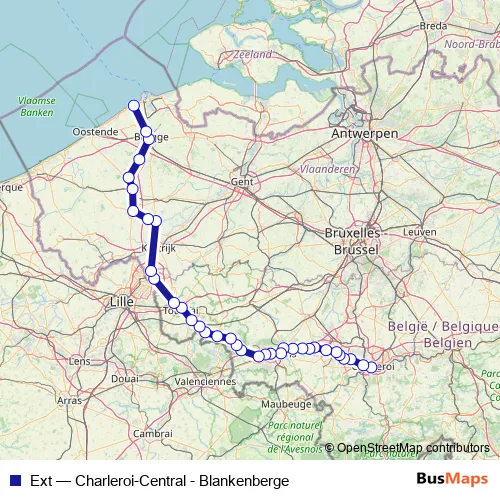The first stop of the Ext rail route is Charleroi-Central and the last stop is Blankenberge. Ext (Charleroi-Central - Blankenberge) is operational during le week-end.