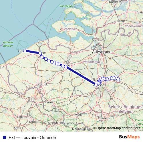 The first stop of the Ext rail route is Louvain and the last stop is Ostende. Ext (Louvain - Ostende) is operational during tous les jours.