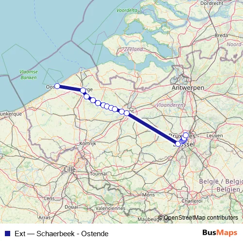 The first stop of the Ext rail route is Ostende and the last stop is Schaerbeek. Ext (Schaerbeek - Ostende) is operational during en semaine.