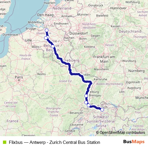 The first stop of the Flixbus bus route is Antwerp Roosevelt Perron and the last stop is Zurich Ausstellungsstrasse. Flixbus (Antwerp - Zurich Central Bus Station) is operational during le week-end.