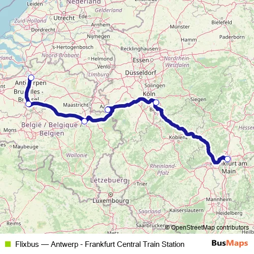 The first stop of the Flixbus bus route is Antwerp Roosevelt Perron and the last stop is Frankfurt Central Train Station (Stuttgarter Str.). Flixbus (Antwerp - Frankfurt Central Train Station) is operational during tous les jours.