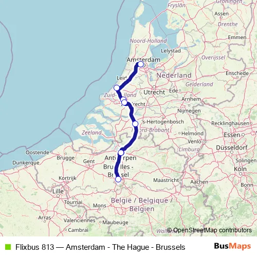 Click here to view the nearest Flixbus 813 - Amsterdam - The Hague - Brussels bus stop.