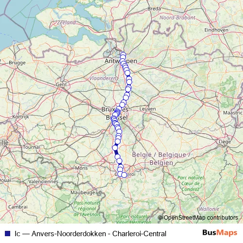 The first stop of the Ic rail route is Anvers-Noorderdokken and the last stop is Charleroi-Central. Ic (Anvers-Noorderdokken - Charleroi-Central) is operational during tous les jours.