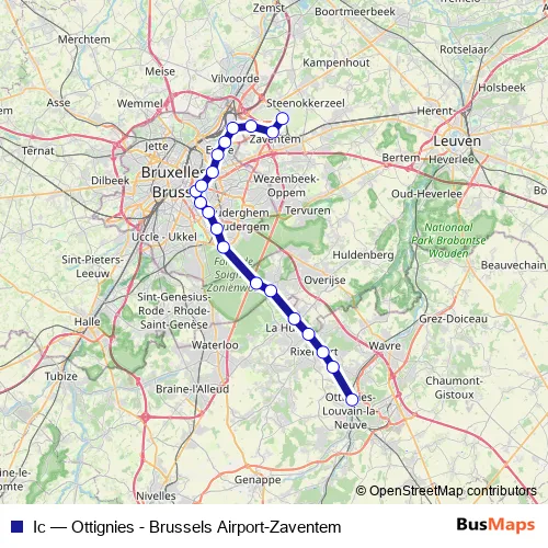 The first stop of the Ic rail route is Ottignies and the last stop is Brussels Airport-Zaventem. Ic (Ottignies - Brussels Airport-Zaventem) is operational during tous les jours.
