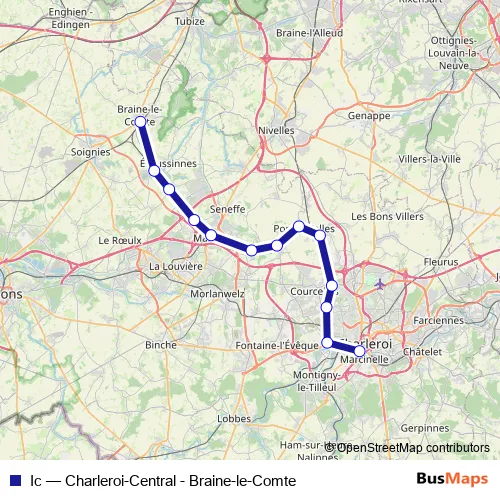 The first stop of the Ic rail route is Charleroi-Central and the last stop is Braine-le-Comte. Ic (Charleroi-Central - Braine-le-Comte) is operational during tous les jours.