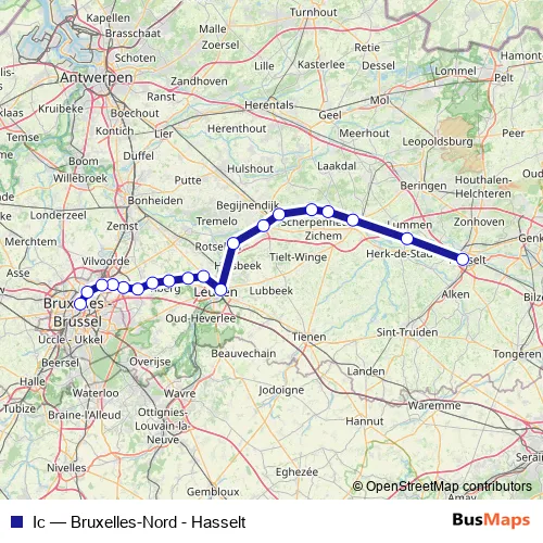 The first stop of the Ic rail route is Hasselt and the last stop is Bruxelles-Nord. Ic (Bruxelles-Nord - Hasselt) is operational during le week-end.