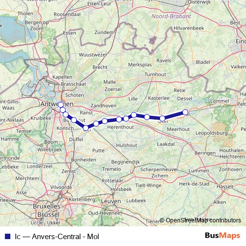 The first stop of the Ic rail route is Mol and the last stop is Anvers-Central. Ic (Anvers-Central - Mol) is operational during tous les jours.