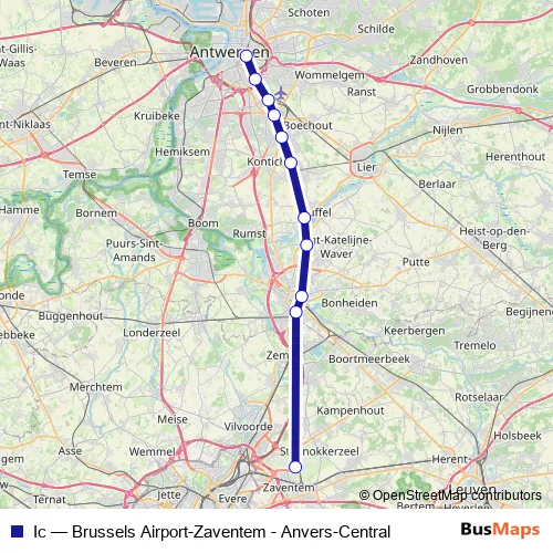 The first stop of the Ic rail route is Brussels Airport-Zaventem and the last stop is Anvers-Central. Ic (Brussels Airport-Zaventem - Anvers-Central) is operational during tous les jours.