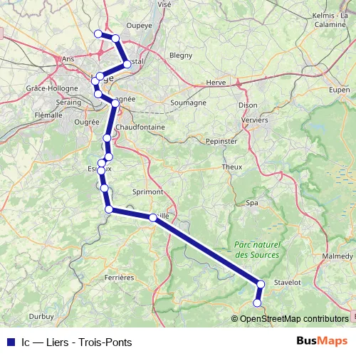 The first stop of the Ic rail route is Trois-Ponts and the last stop is Liers. Ic (Liers - Trois-Ponts) is operational during le week-end.
